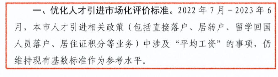 此外,本次文件还指出,2022年7月-2023年6月,人才引进相关政策中涉及“平均工资”的事项,仍维持现有基数标准作为参考水平。